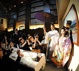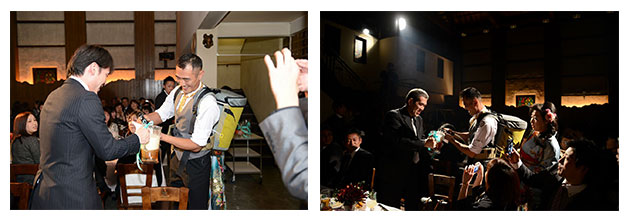 会場を彩るお花や当日お召しになるお衣装、番傘を手にする入場演出や、ゲストの皆様に大雪地ビール館自慢の大雪ピルスナーを振る舞いたい!とビアタンクを背に新郎新婦テーブルラウンドを。